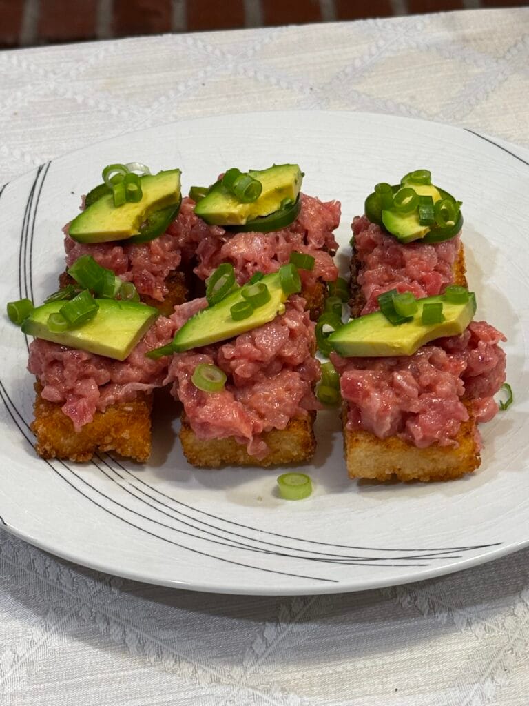 Frustrated and hungry, we took matters into our own hands the next day. We went to Santa Monica Seafood, bought our own Tuna and Toro, and brought it home. We had a chef prepare Tuna Crudo and Spicy Tuna crispy rice right in our own kitchen.